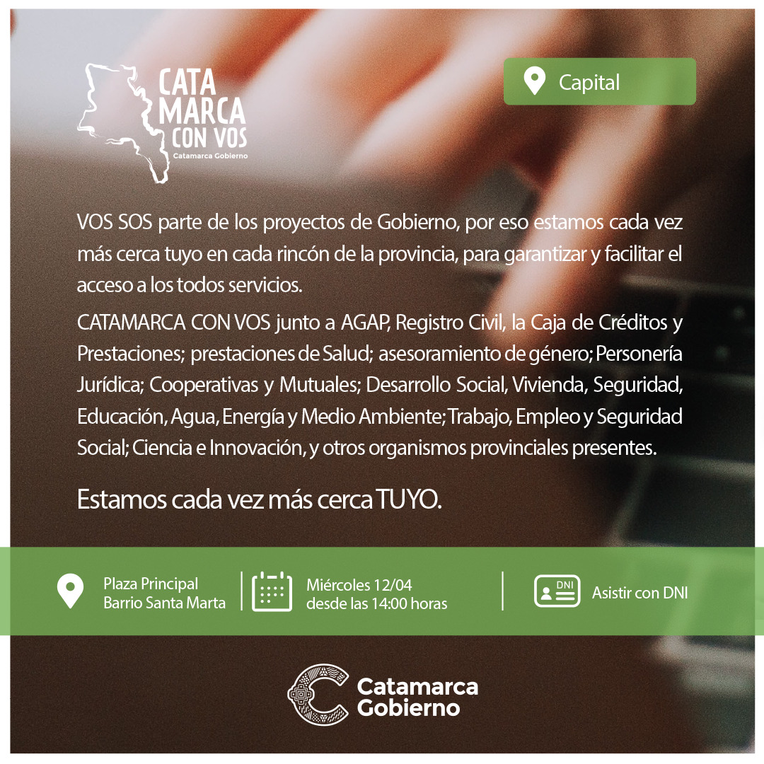 El programa provincial que acerca los trámites y servicios a todos los catamarqueños llega al Barrio Santa Marta. A través de móviles ubicados en puntos estratégicos, “Catamarca con Vos†en conjunto con “Municipio en tu Barrioâ€, estará presente este miércoles 12 de abril, de 14:00 a 18:00 horas en la plaza principal del barrio, ubicado al sur de la ciudad Capital.