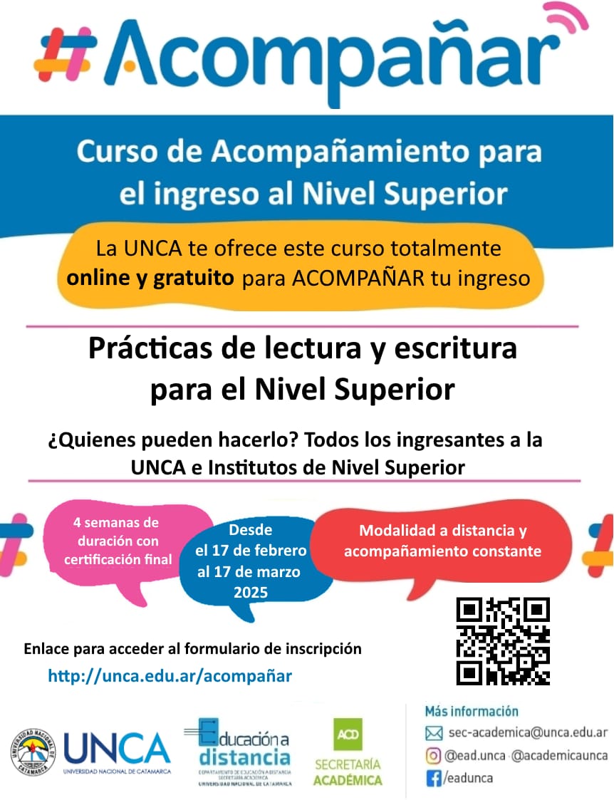 El Departamento de Educación a Distancia, dependiente de la Secretaría Académica de la UNCA, informa que se encuentran abiertas las inscripciones para la edición febrero-marzo 2025 del Curso de Acompañamiento para el Ingreso al Nivel Superior “ACOMPAÑARâ€.