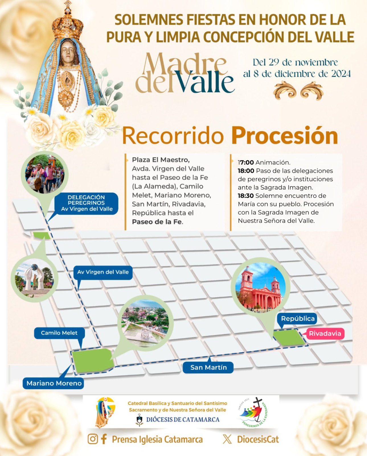 La Solemne Procesión se podrá seguir en vivo por las redes sociales del Santuario Catedral y del Obispado: Youtube: Virgen del Valle y Prensa Obispado Catamarca; Facebook: Santuario Virgen del Valle Catamarca y Prensa Iglesia Catamarca. También habrá transmisión especial de Radio TV Valle Viejo.