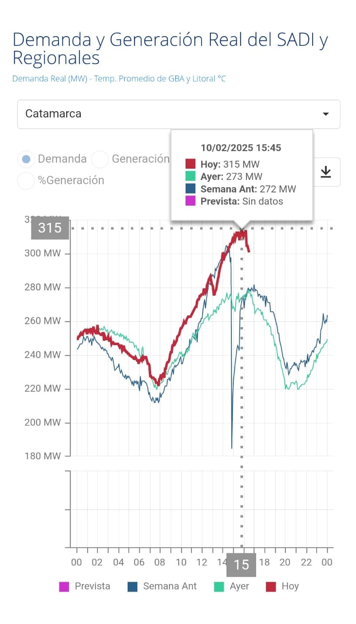 El calor extremo llevó el consumo de energía a un nivel histórico en Catamarca y toda la Argentina. A las 15,45 de este lunes, la demanda superó los 315 MVA en Catamarca según informó CAMMESA. El registro dejó atrás el récord previo de 305 MVA alcanzado el sábado pasado.