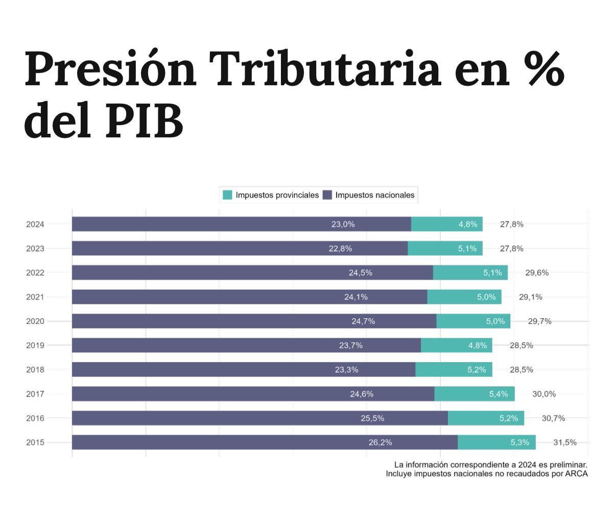 Según el informe, la presión tributaria total (sumando impuestos nacionales y provinciales) alcanzó en 2024 el 27,8% del PBI, mismo nivel que en 2023. Sin embargo, al desagregar el dato, el fenómeno es claro: los impuestos nacionales representan actualmente el 23% del producto, en niveles prácticamente récord, mientras que los tributos provinciales bajaron al 4,8%, lejos del 5,4% que supieron alcanzar en 2017 y del 5,3% de 2015.