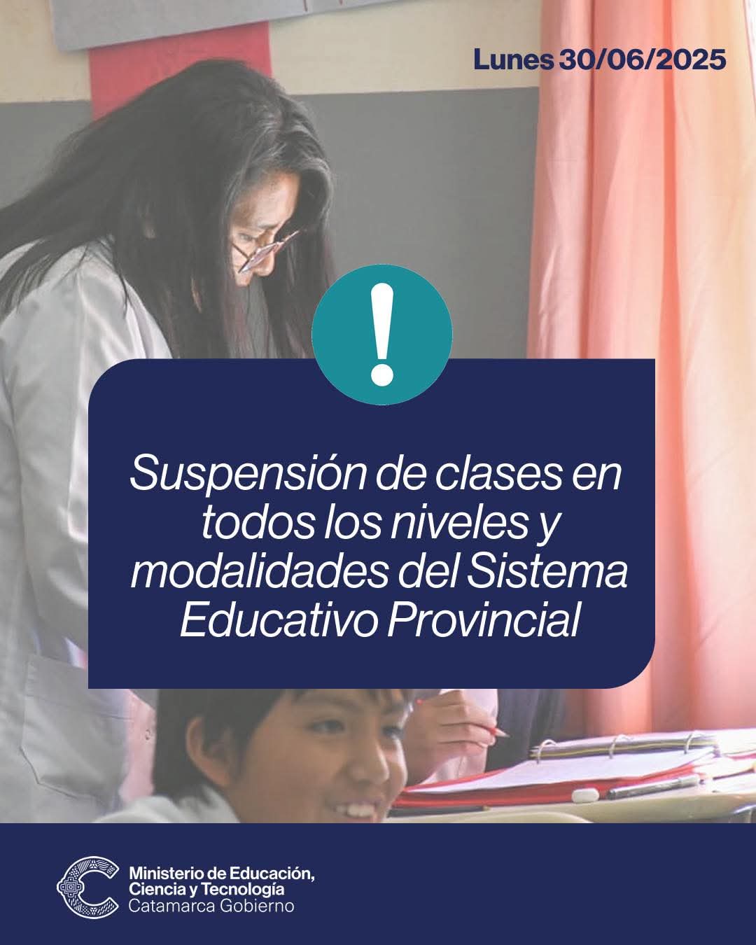 El Ministerio de Educación, Ciencia y Tecnología de Catamarca dispuso la suspensión de las actividades escolares para este lunes 30 de junio en todos los establecimientos educativos de gestión pública y privada de la provincia.