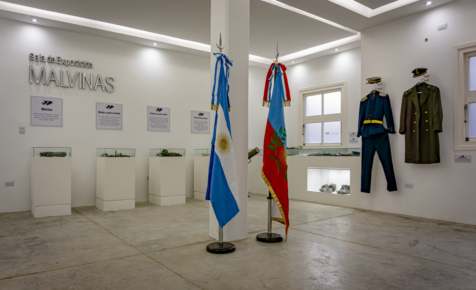 La sala central cuenta con una exposición permanente de trajes, calzado y elementos que fueron utilizados por ex combatientes, también cuenta con un paracaídas, fotografías y cartas del año 1982.