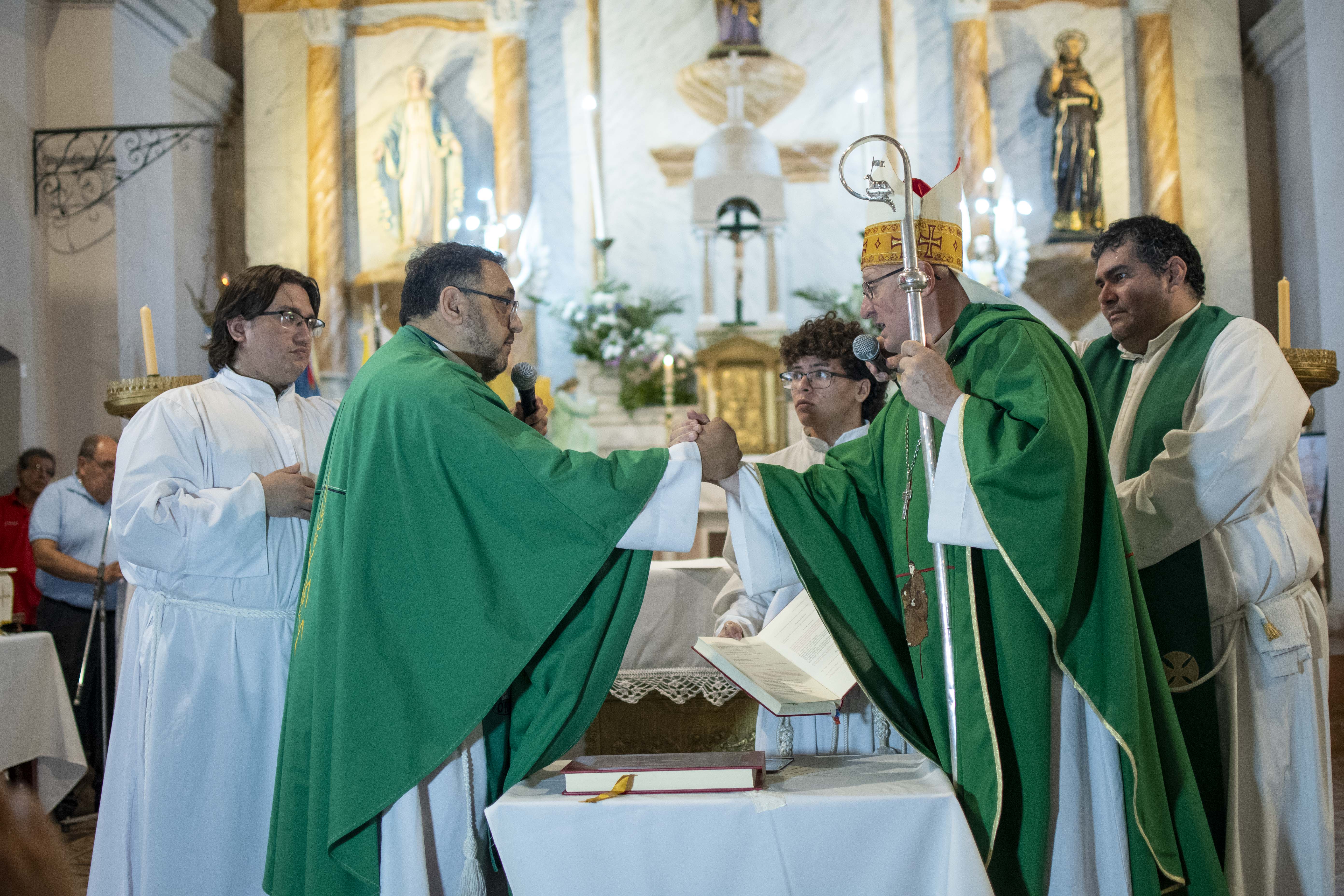 La Santa Misa fue presidida por el obispo diocesano, Mons. Luis Urbanc y concelebrada por los párrocos entrante y saliente, padres Marcelo Amaya y Carlos Robledo, respectivamente; los sacerdotes Diego Manzaraz, canciller y secretario general de la Curia Diocesana; Lucas Segura, vicario para la Educación; Víctor Vizcarra, Rogelio Suárez, Eugenio Pachado, Martín Melo y Eduardo Navarro, párrocos del Espíritu Santo (Capital), Nuestra Señora del Rosario (Paclín), Jesús Niño (Capital), Nuestra Señora de Belén (Belén) y Santa Ana y San Joaquín (Miraflores), respectivamente.